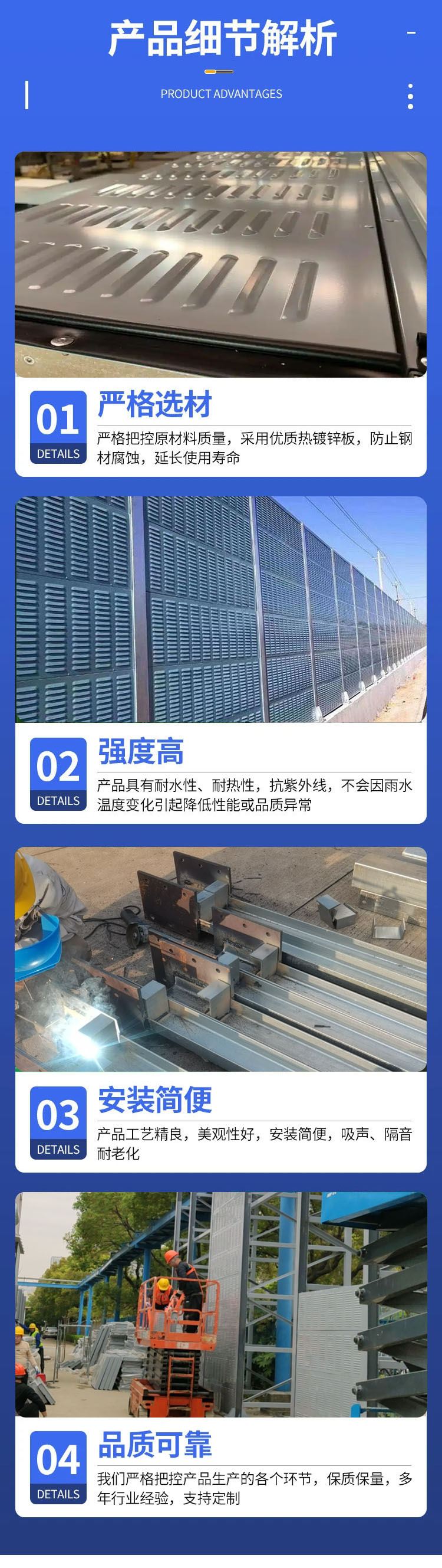 材質:金屬;鍍鋅板、鋁板。 外形:凹凸插接,平行,弧度,折角聲屏障。 孔型:金屬圓孔型聲屏障,百葉孔型聲屏障。
